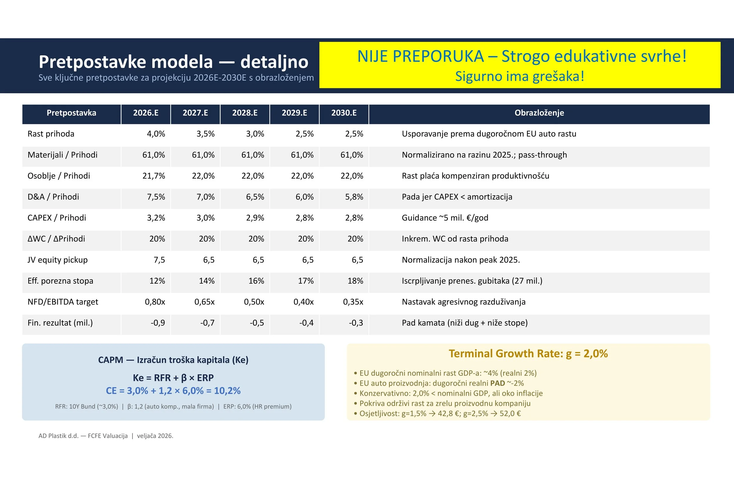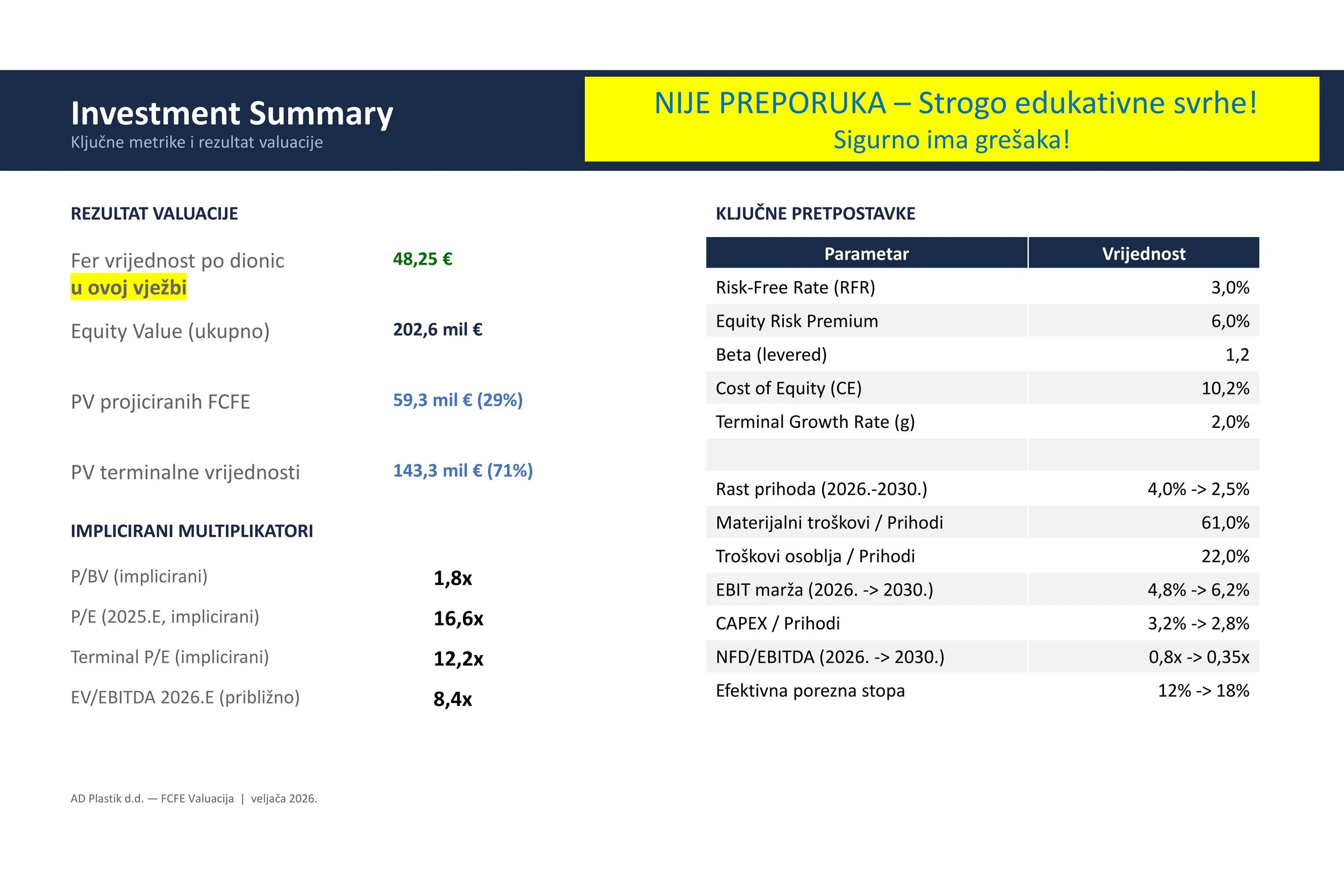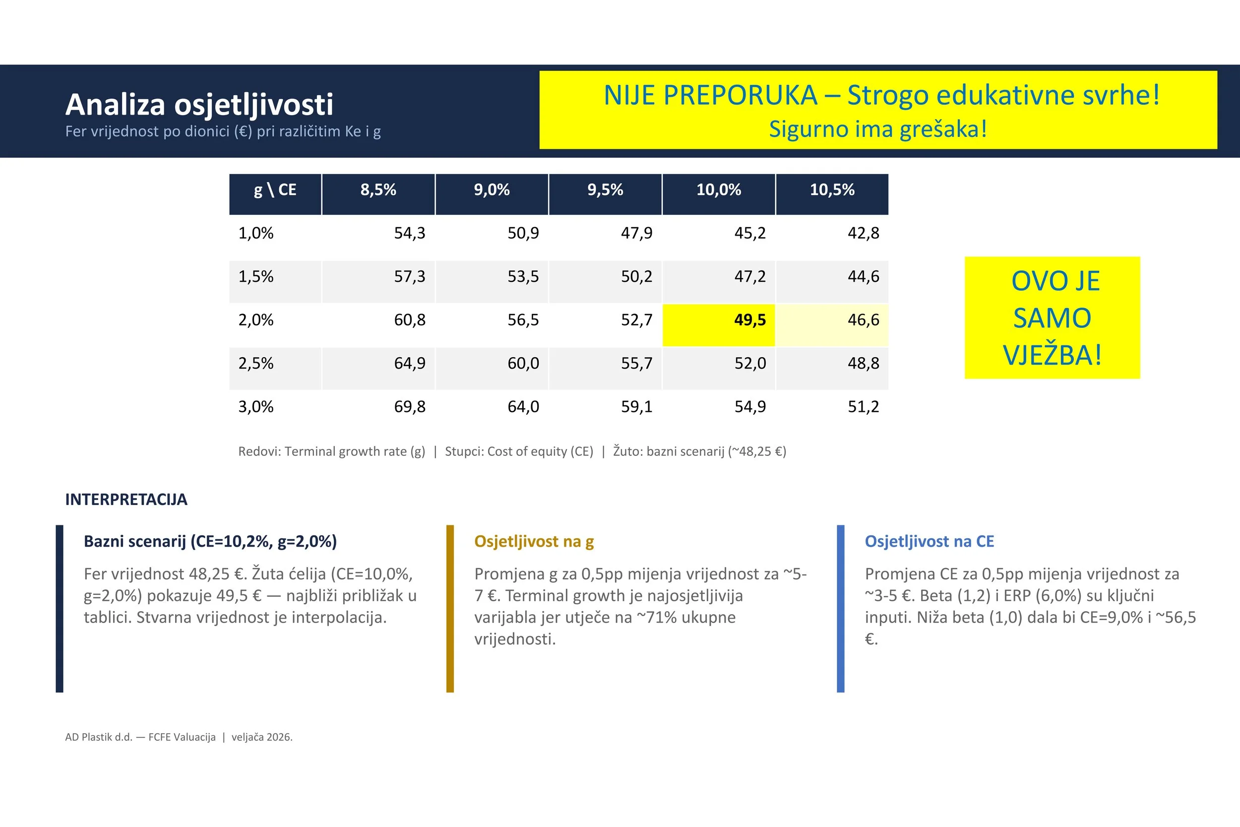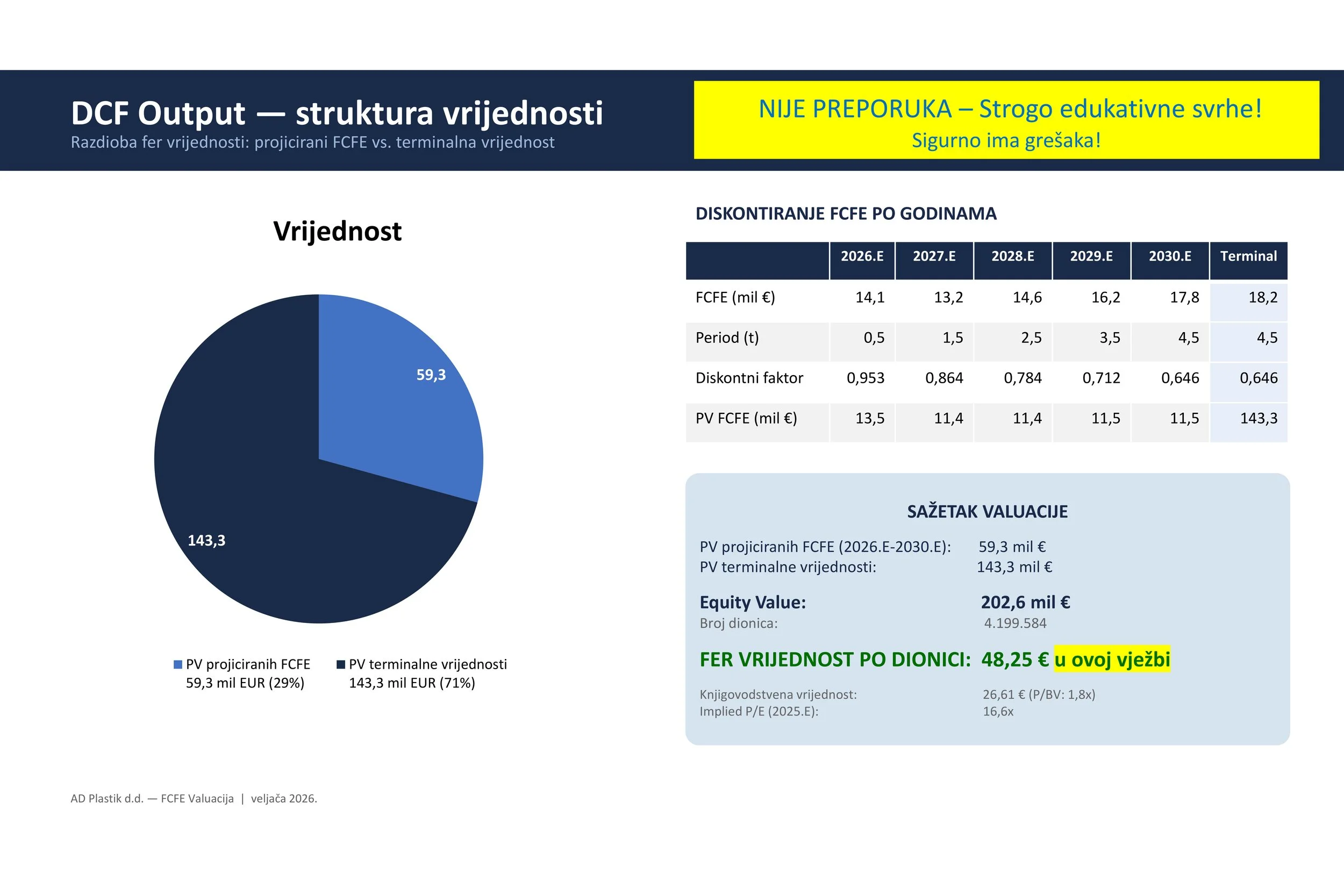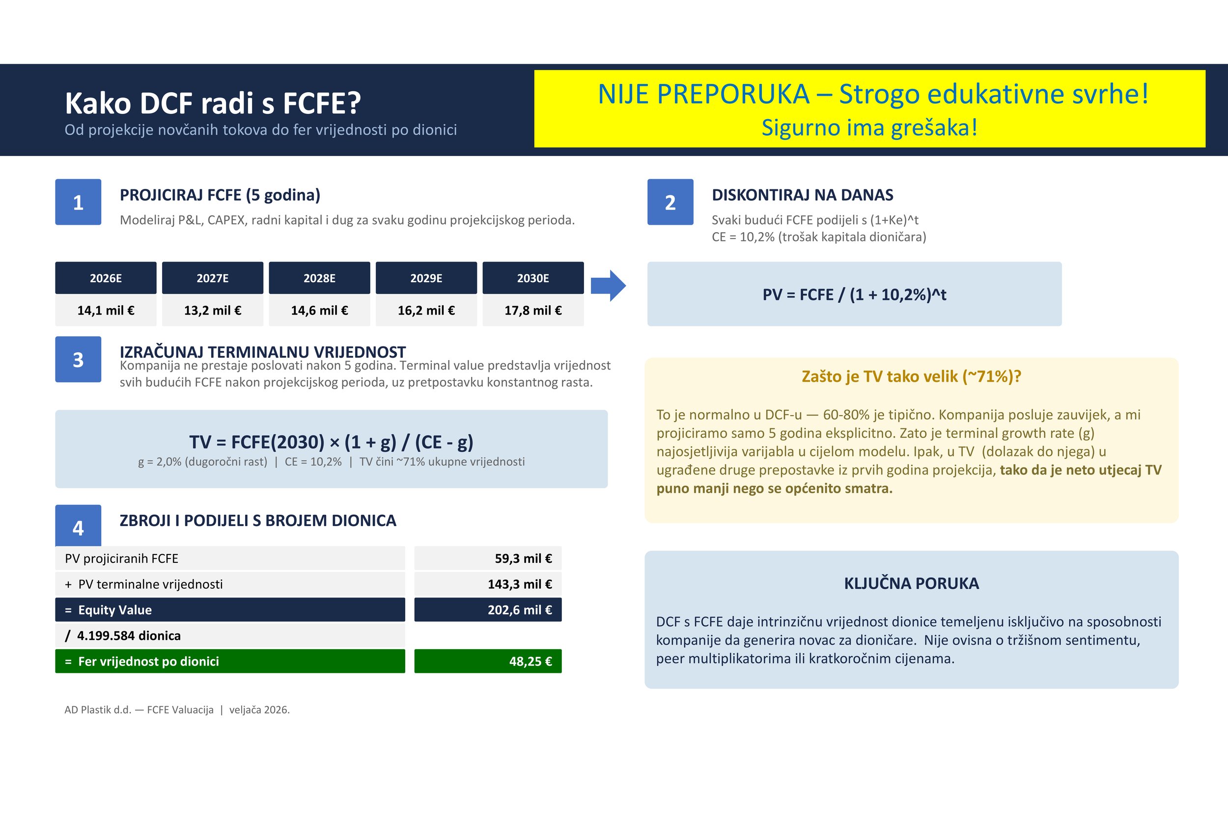 Još jednom: Ovo nije nikakva preporuka niti ciljana cijena, nego primjer kako možemo u valuaciju dionca uključiti razne opće teme i upotrijebiti standardne valuacijske modele. Sve ovo može biti pogrešno i za eventualna ulaganja računajte sami ili se obratite svom omiljenom profesionalcu (ne zaboravite pri tome ih se 95% smijalo na moje primjere valuacija za Končar).