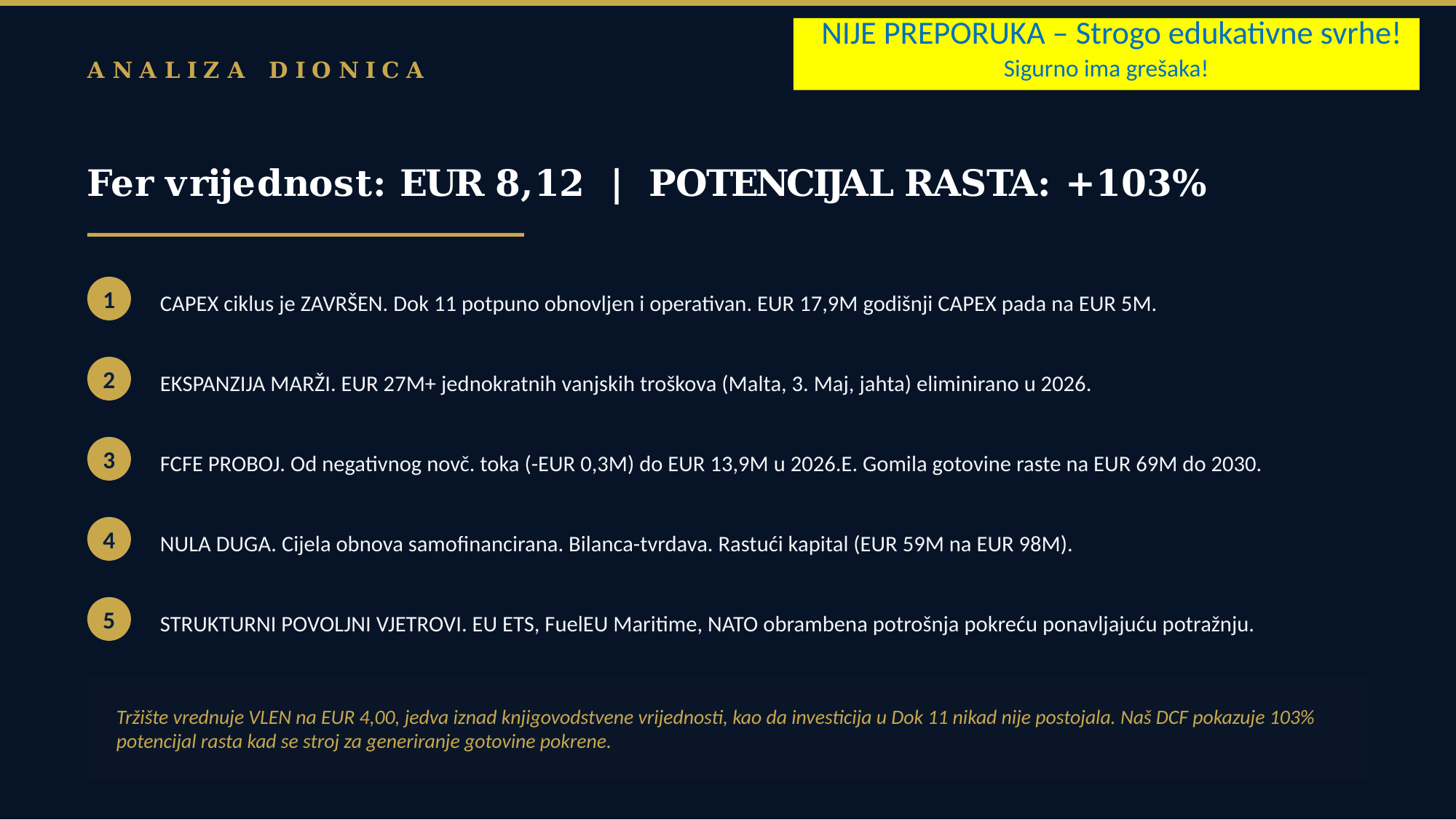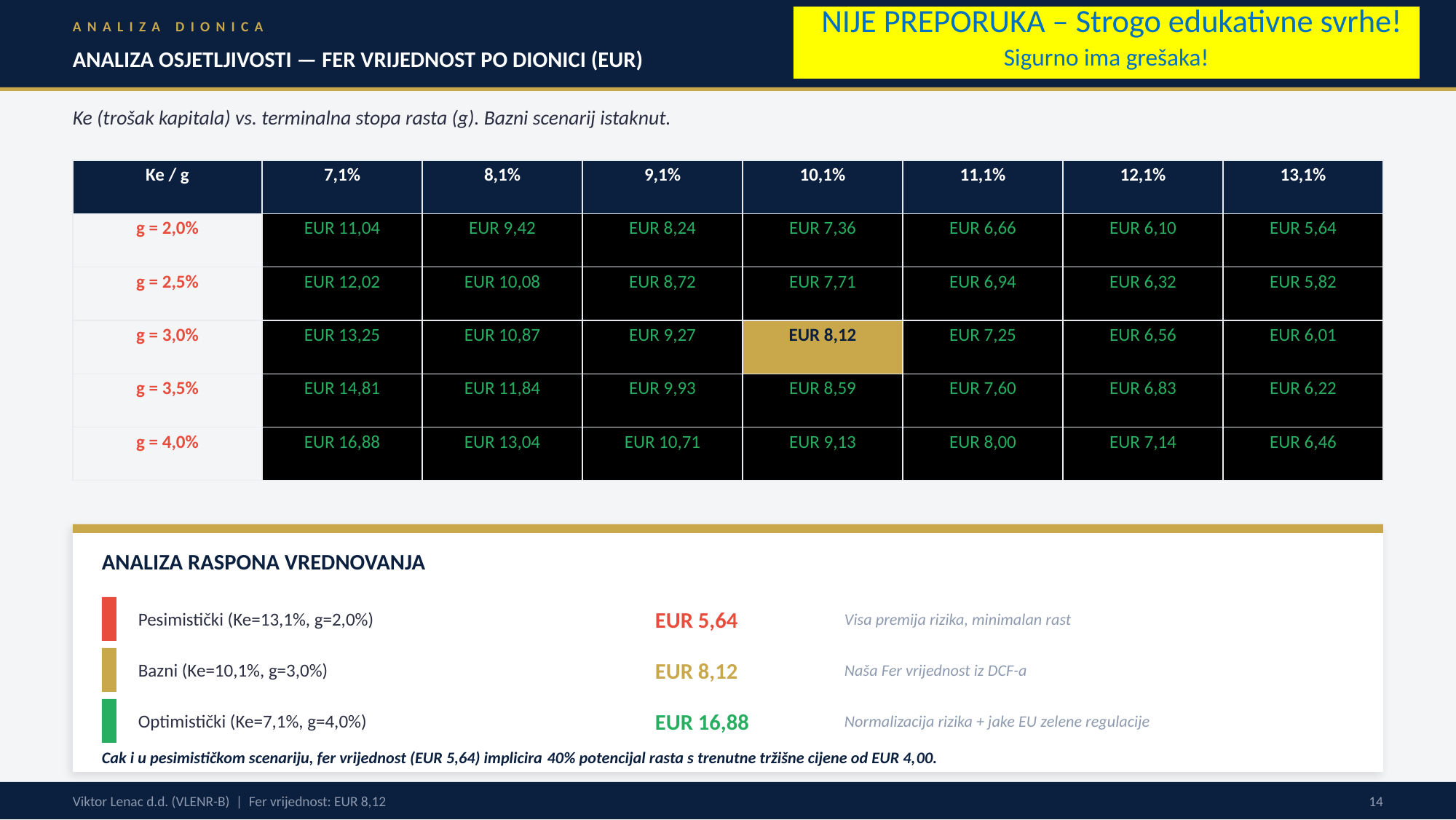Još jednom: Ovo nije nikakva preporuka niti ciljana cijena, nego primjer kako možemo u valuaciju dionca uključiti razne opće teme i upotrijebiti standardne valuacijske modele. Sve ovo može biti pogrešno i za eventualna ulaganja računajte sami ili se obratite svom omiljenom profesionalcu (ne zaboravite pri tome ih se 95% smijalo na moje primjere valuacija za Končar).
